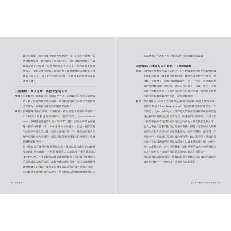 在本書中,你會學到如何運用團體動力學來更好地與別人一起工作和生活。能夠讓團體和我們自己發揮全部潛能的祕訣,就是能讓人們有效協作的六大條件:團隊組成、目標、任務、規範、心理安全感和指導。達成這六大條件,就能讓你發揮出團體動力學長期遭到忽視的巨大潛能。理解它們,就是打造有效率且有滿滿成就感團隊的關鍵。