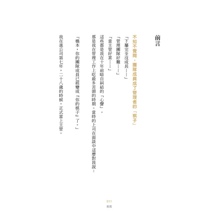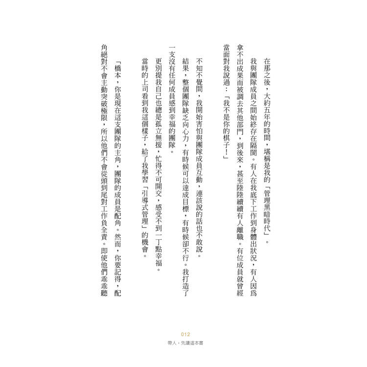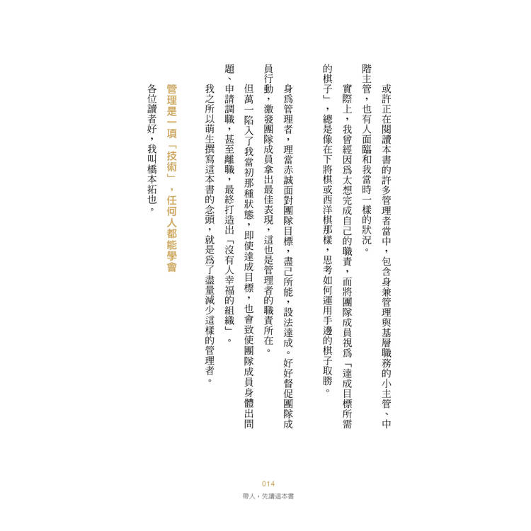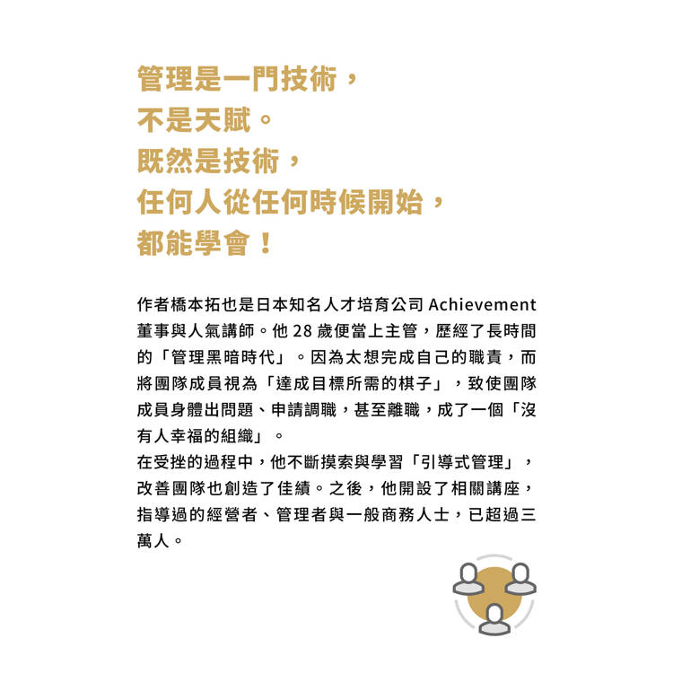 作者橋本拓也是日本知名人才培育公司Achievement董事與人氣講師。他28歲便當上主管,歷經了長時間的「管理黑暗時代」。因為太想完成自己的職責,而將團隊成員視為「達成目標所需的棋子」,致使團隊成員身體出問題、申請調職,甚至離職,成了一個「沒有人幸福的組織」。