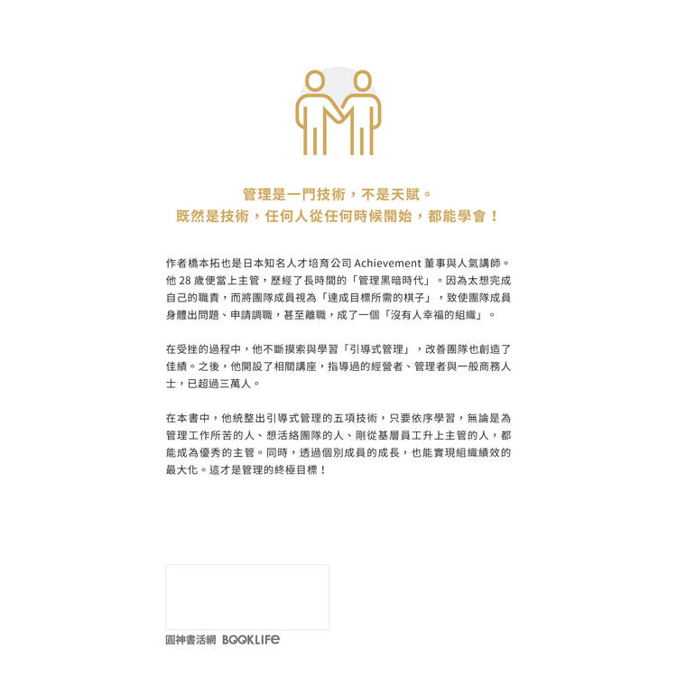 在本書中,他統整出引導式管理的五項技術,只要依序學習,無論是為管理工作所苦的人、想活絡團隊的人、剛從基層員工升上主管的人,都能成為優秀的主管。同時,透過個別成員的成長,也能實現組織績效的最大化。這才是管理的終極目標!