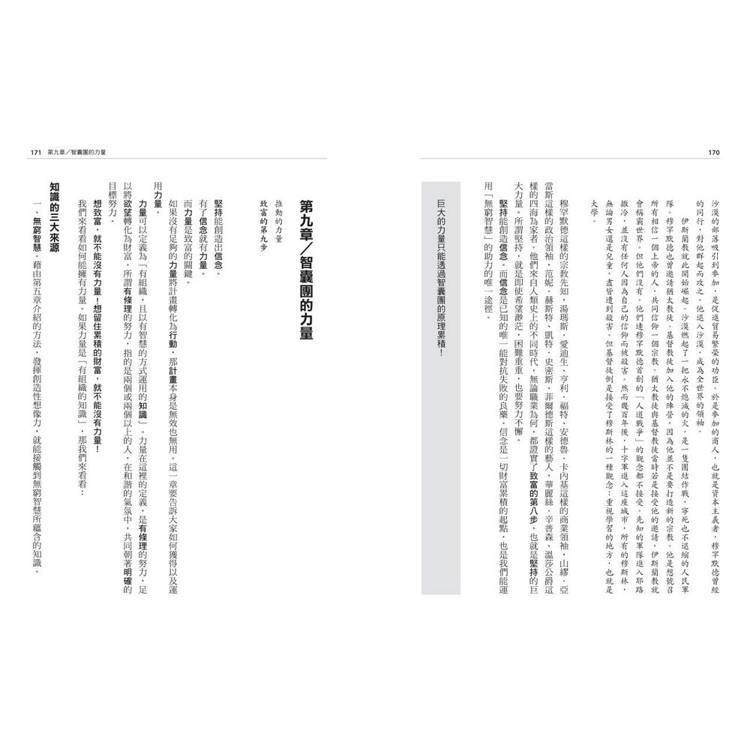 但《思考致富》的力量遠不只書中傳授的原則。這本書的吸引力,有一部分在於拿破崙.希爾不可思議的精準預言,完全預料到「現在」的問題。他談到的概念包括建立人脈、參與式管理、卓越的客戶服務、視覺化技術、腦力激盪,以及以書面寫下目標。要到多年以後,這些才會成為企業界與心理學的術語。甚至要到多年以後,這些術語才會出現。他幾乎用了一整章的篇幅,談師徒的概念,但他從未提及師徒二字,還給予獨特的「希爾式解讀」。他對於人類大腦功能的看法,與後來所有的左右腦研究不謀而合。他在這本書談到不少自我分析的測試,每一個至今仍然十分實用,僅僅是這些測試,就已值回書價。在「裁員」一詞大為流行的五十年之前,拿破崙.希爾就曾詳細闡述若是突然不得不找工作,或是不得不創業,該採用哪些策略與戰術。他對於資本主義的定義與意義的分析(見第六章),是至今最強而有力,也是最有說服力的分析,每個人都該看看。
