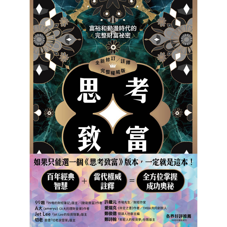 無論你住在哪一鎮,哪一州,哪一省,還是哪一國,你的個人成功書庫,絕對不能少了這一本全新還原修訂,有詳盡的註釋與索引的《思考致富》。不僅有原版的完整內容,也有還原的資料,比當年寫作的時候更貼近現在的經濟。《思考致富》主要目的之一,就是傳授能實現財富自由,甚至巨大財富的步驟。但這本好書最大的價值,其實不是能讓你致富,而是能讓你,應該說能讓任何人,實現自己定義的成功,得到此生想追求的一切。
