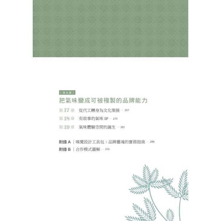✧ 劃分初學者、創業者、空間/策展設計者、內容行銷人、專業開發者、快速學習等不同閱讀路線,並附上氣味設計工具包、合作模式圖解,將嗅覺策略轉化為提案、營運與共創的實用表格與模組清單,打開即用!