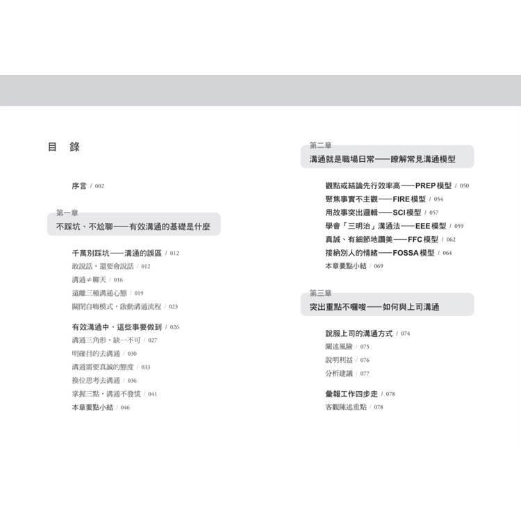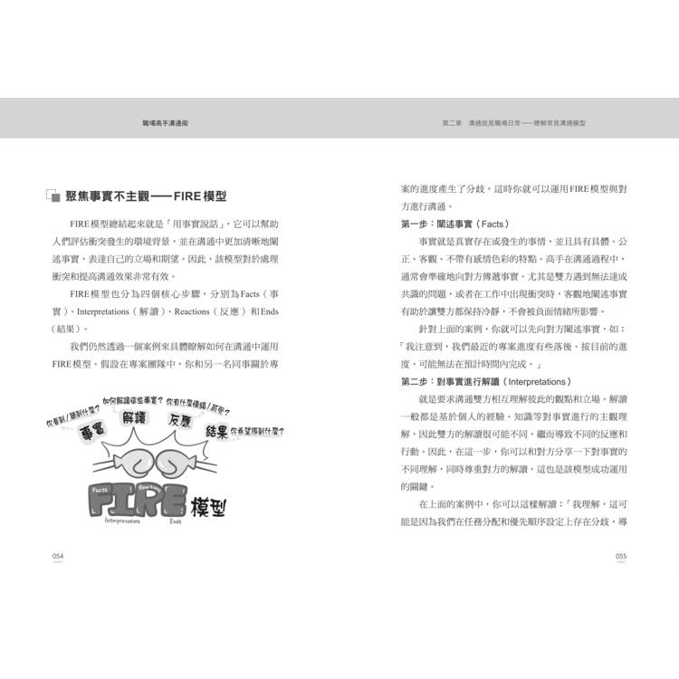 本書完整整理PREP、FIRE、EEE等六大實用溝通模型,並結合大量實務案例、真實對話場景與圖解說明,