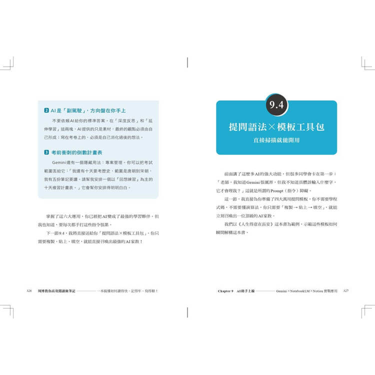 身為一個擁抱科技的教育者,我深知AI不是學習的敵人,而是最強的隊友。在書中,我示範了如何利用Google的Gemini進行蘇格拉底式的對話引導,如何用 NotebookLM將幾百頁的講義瞬間變成專屬的廣播與知識庫,以及如何用Notion 打造個人的數位大腦。