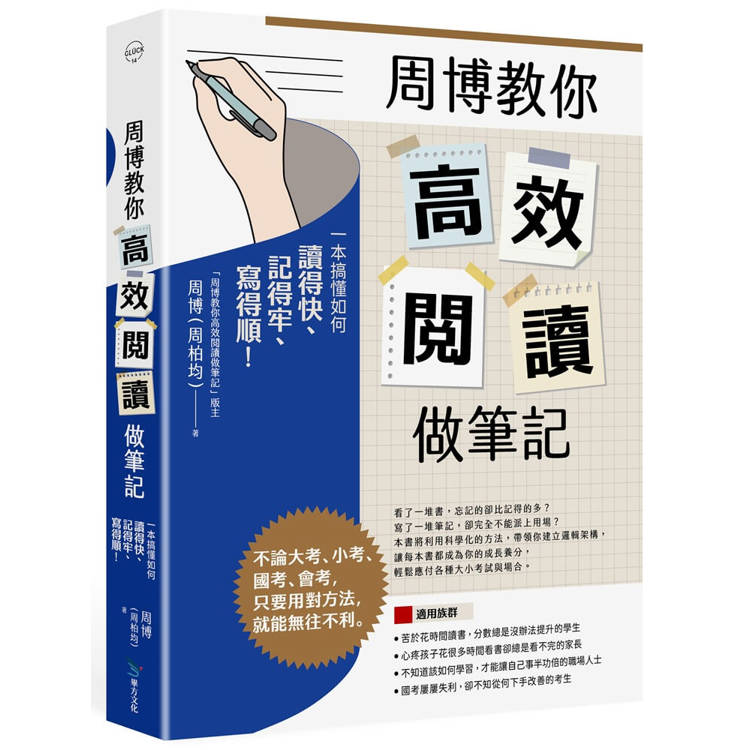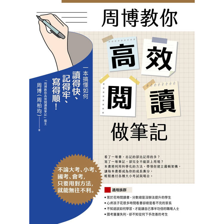 看了一堆書,忘記的卻比記得的多?寫了一堆筆記,卻完全不能派上用場?帶領十萬粉絲領略高效率閱讀的周博,將以清楚的說明與範例帶你拆解閱讀地雷,利用科學化的閱讀筆記法,帶領你建立邏輯架構。從輸入到輸出,讓每本書都成為你的成長養分,輕鬆應付各種大小考試與場合。