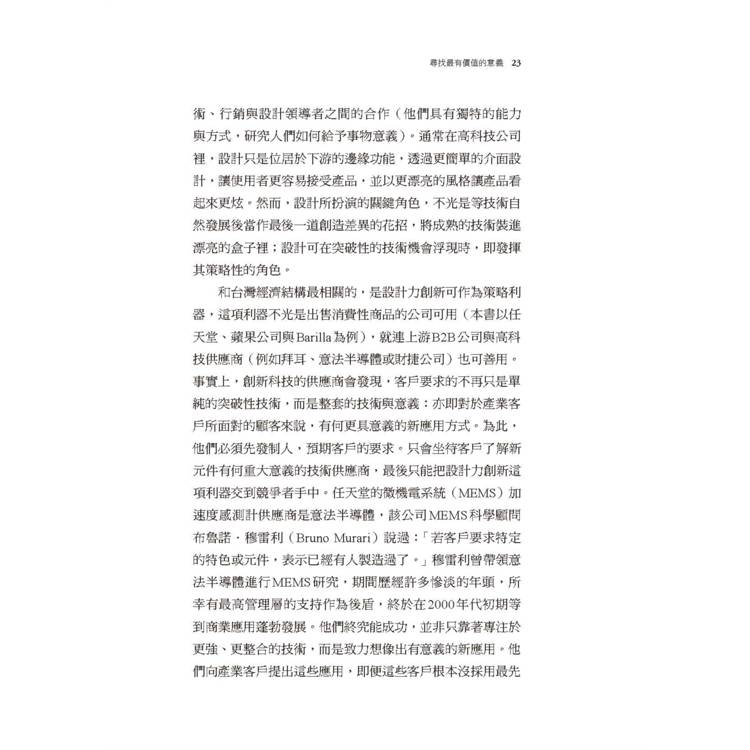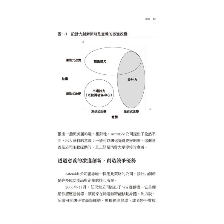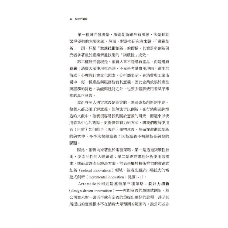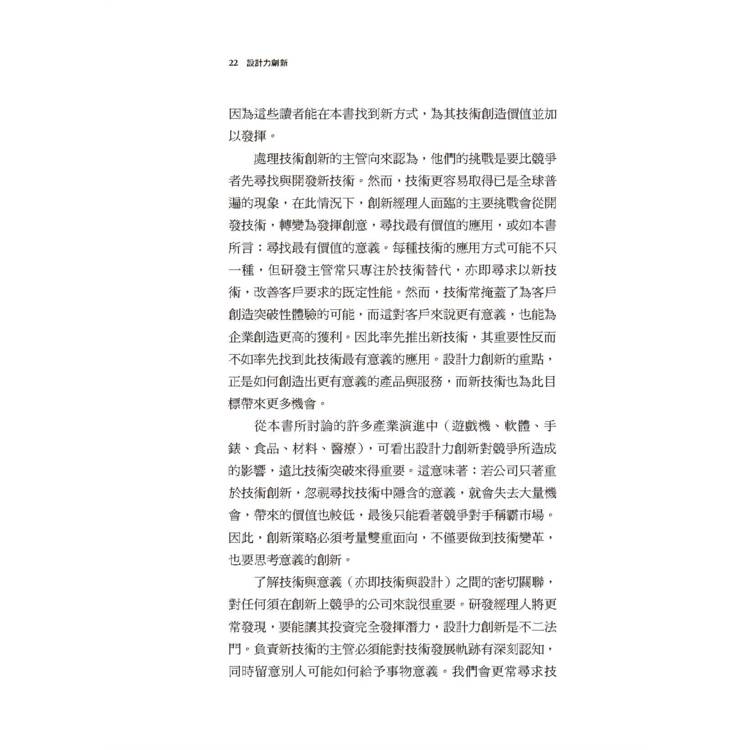 這項策略稱為設計力創新(design-driven innovatiion),因為「設計」從詞源的本義來看,代表「賦予事物意義」。設計力創新是意義的研發流程,本書闡述一家公司該如何管理這個流程,亦即如何領先同業、徹底顛覆產業的主流意義,進而在競爭中脫穎而出。