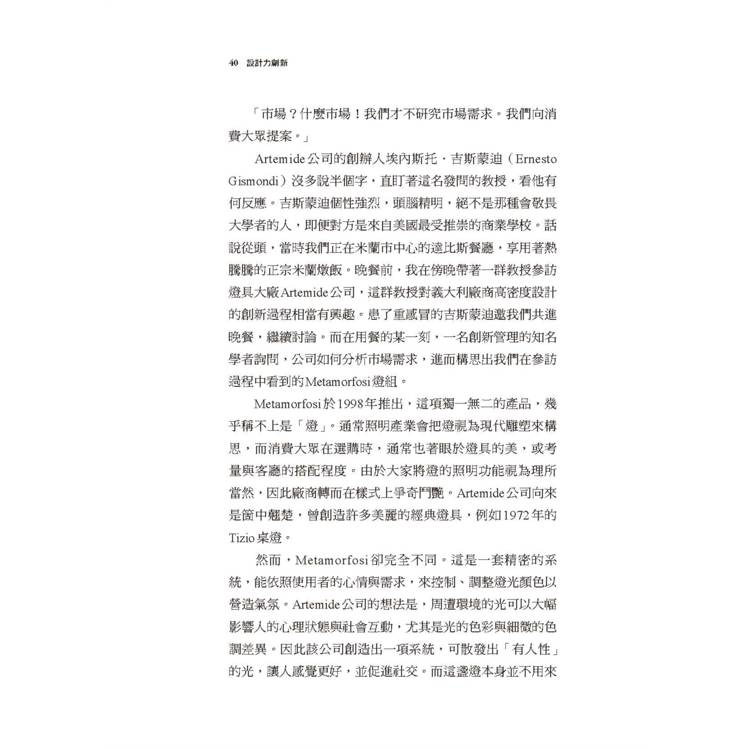 Artemide 公司的創辦人埃內斯托.吉斯蒙迪(Ernesto Gismondi)沒多說半個字,直盯著這名發問的教授,看他有何反應。吉斯蒙迪個性強烈,頭腦精明,絕不是那種會敬畏大學者的人,即便對方是來自美國最受推崇的商業學校。話說從頭,當時我們正在米蘭市中心的達比斯餐廳,享用著熱騰騰的正宗米蘭燉飯。晚餐前,我在傍晚帶著一群教授參訪燈具大廠 Artemide 公司,這群教授對義大利廠商高密度設計的創新過程相當有興趣。患了重感冒的吉斯蒙迪邀我們共進晚餐,繼續討論。而在用餐的某一刻,一名創新管理的知名學者詢問,公司如何分析市場需求,進而構思出我們在參訪過程中看到的 Metamorfosi 燈組。