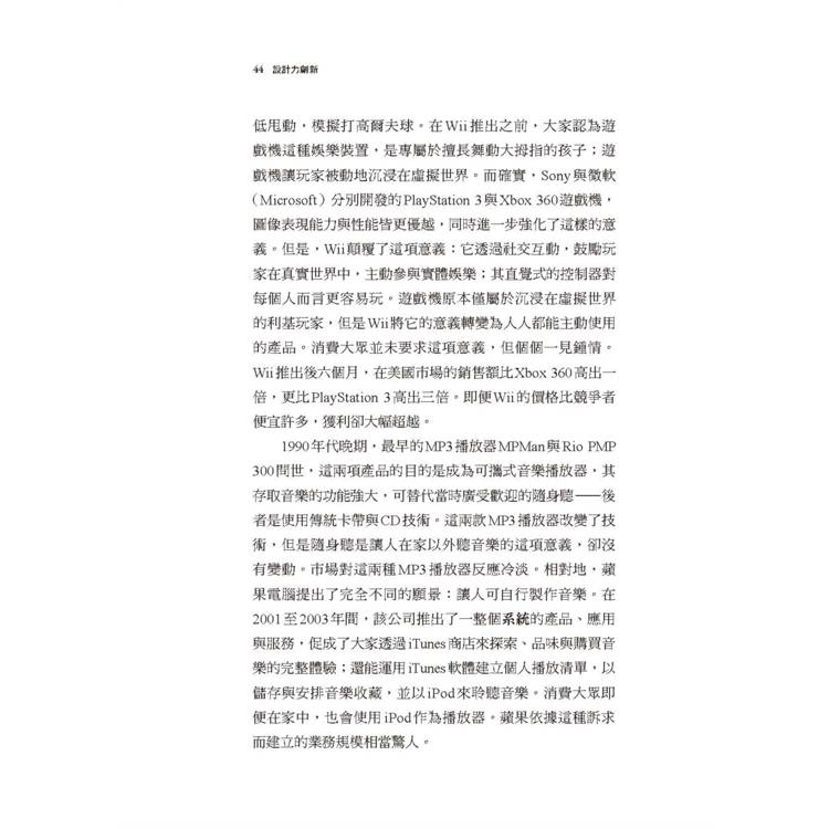 這些用企管專業用語堆疊起來的詮釋,反倒讓人覺得深奧難懂而無法一窺其中的奧妙。但是,事實上「設計力創新」概念的產品,就在我們日常生活當中,從口袋裡的 Apple 產品到手上的 Swatch 手錶,從廚房裡的 Alessi 水壺到書房裡的 Herman Miller 椅子,再到客聽裡的 Bang & Olufsen 視聽與 Nintendo Wii 的娛樂,都是設計力創新的代表,都能給予物件一個新的時代意義。原來,我們已經生活在一個設計力創新的社會當中。