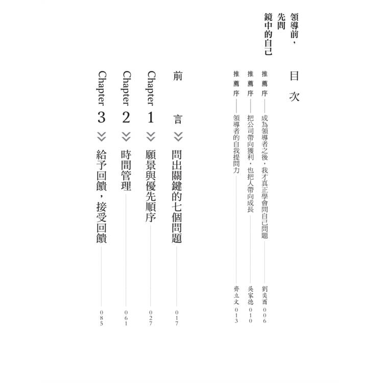 3.適合「高處不勝寒」高階領導者:透過書中一步步自我提問,你將學會如何建立「回饋機制」,踏出決策孤島。