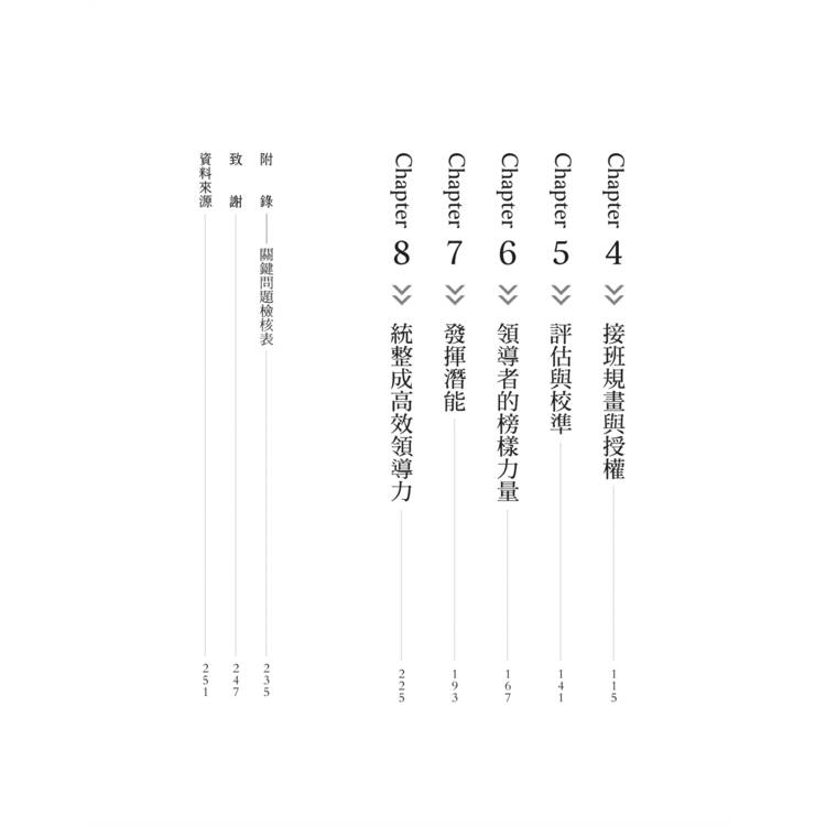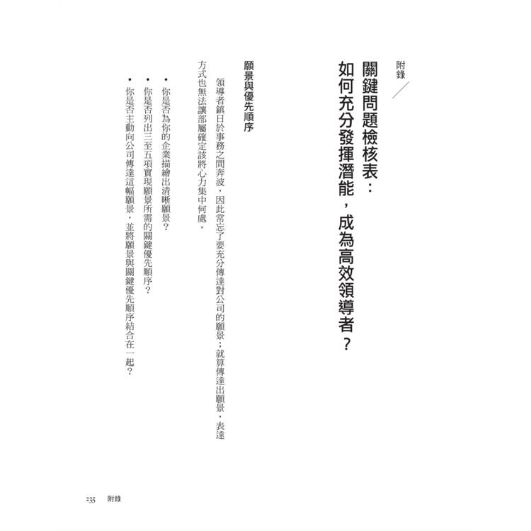 這本書有八大章節。書寫的順序非常按部就班,讓讀者慢慢進入領導的情境與思考模式。除了文章有系統的書寫,我另一個最大的收穫是「附錄」。也就是書中最後提到「不可不問的關鍵問題」。