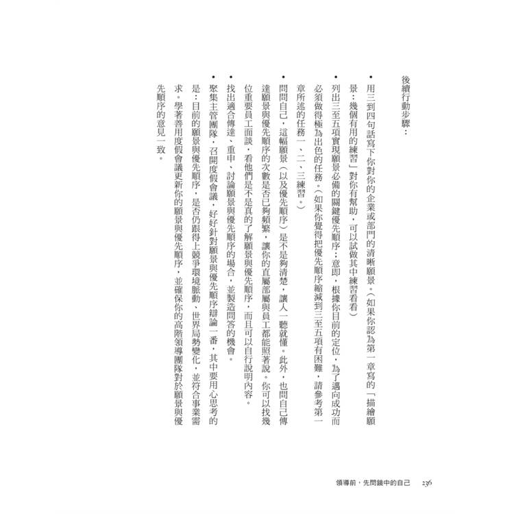 如同《領導前,先問鏡中的自己》這本書所言,領導人必須清楚描繪組織的「未來願景」,並聚焦三到五個最關鍵的優先事項,讓團隊成員知道方向與目標,以便一起眾志成城,點石成金。我在策略會議中,就是會跟夥伴分享,明年公司最重要的核心目標。所以,當我閱讀這本書時,彷彿跟作者心靈相通,共識一致。