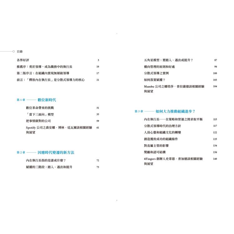 ・第2章〈因應時代變遷的新方法〉:概述釋放內在執行長的涵義,同時講解分散式領導的基本概念。