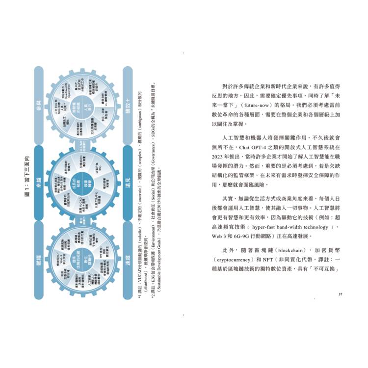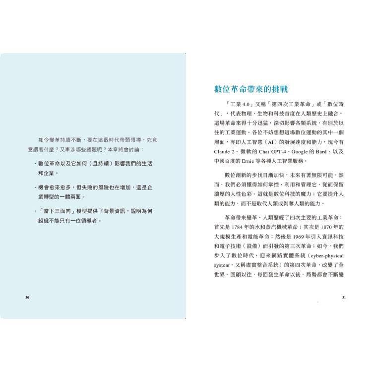 ・第1章〈數位新時代〉:說明背景,講述為何分配領導力如此重要。本章概述目前的情況,指出推動這種文化變革的範圍、規模和速度(即「當下三面向」)。