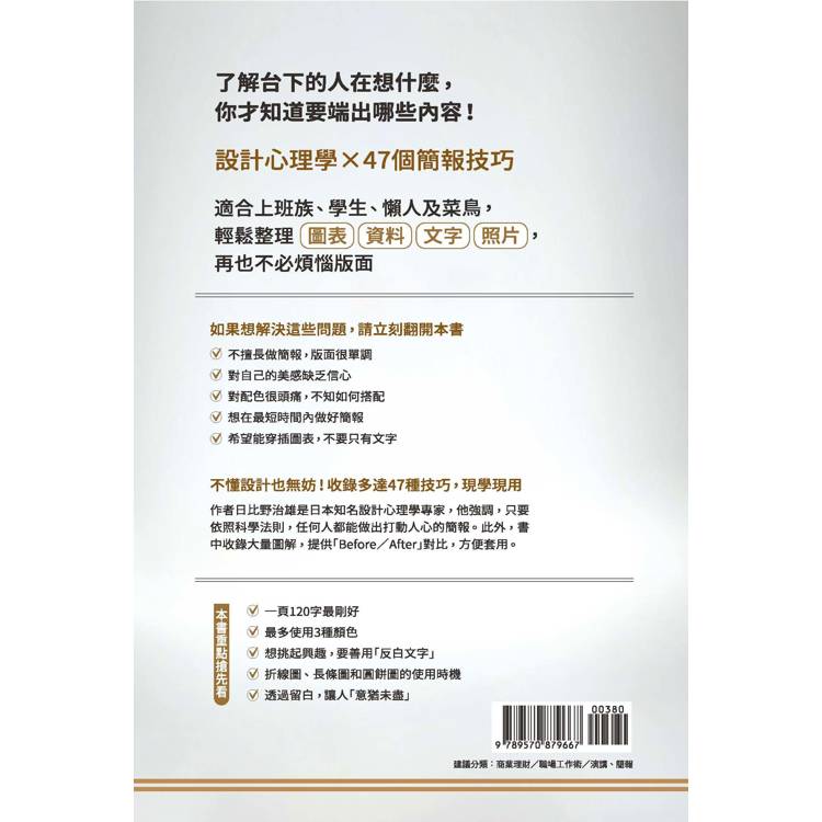 事實上,製作易於理解的簡報並不需要天分,作者日比野治雄是日本知名設計心理學專家,他強調,已有科學證明,優秀的簡報可以依循科學法則來完成。