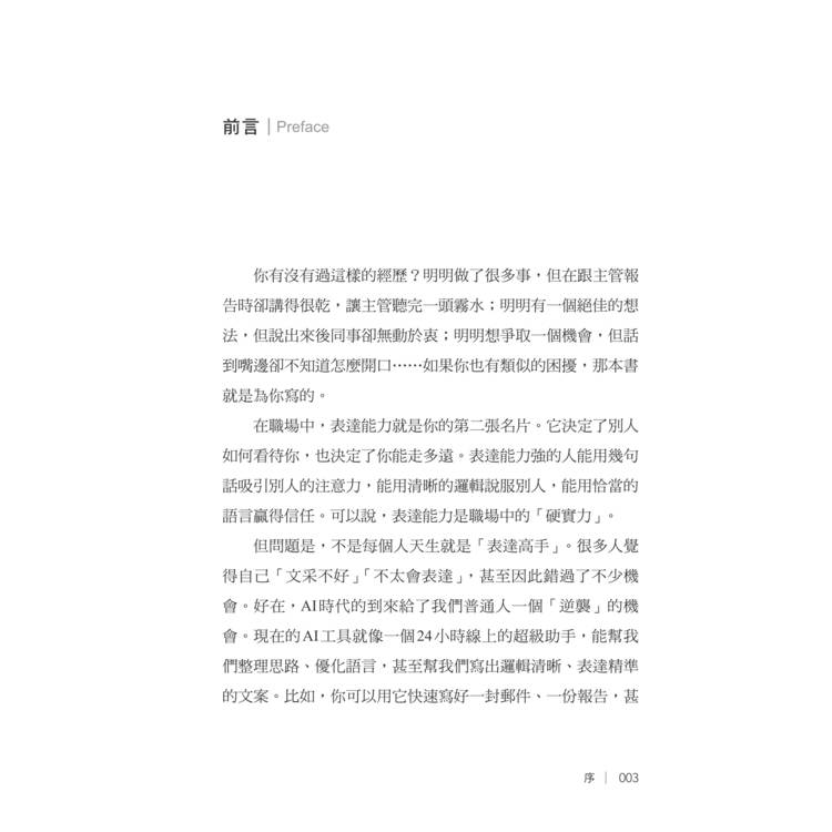 別擔心,本書將教你善用 AI 工具破解表達痛點,翻轉你的職場話語權!