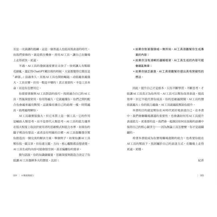 本書的目的就是幫你在 AI 時代更好地表達自己。在本書中,我們會聊職場溝通的重要性,也會講如何用 AI 工具提升表達能力。更重要的是,我們會一起探討如何在技術的浪潮中保持自己的核心競爭力——因為無論工具怎麼變,你才是最關鍵的。