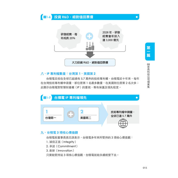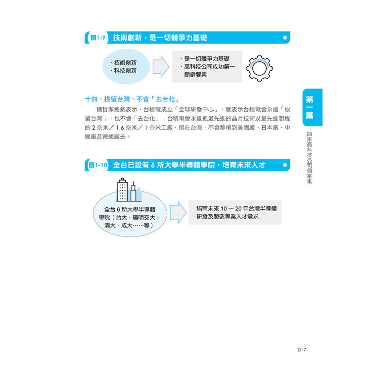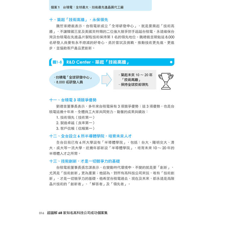 業、資訊與通訊技術(ICT)產業及光電產業等,更是影響台灣經濟壯大的核心關鍵所在。而且,目前上市櫃公司 1,900 多家中,由高科技公司創造出來的台灣股市權值,更占了 70% 之多;此均顯示出高科技公司所扮演角色的高度重要性。此等因素,引發了作者個人對這些高科技公司為何能夠經營成功的祕訣所在及關鍵成功因素的好奇心,故有本書的誕生。作者本人經過長時間搜集 68 家國內外知名且卓越的高科技公司,加以探索而成為本書內容。