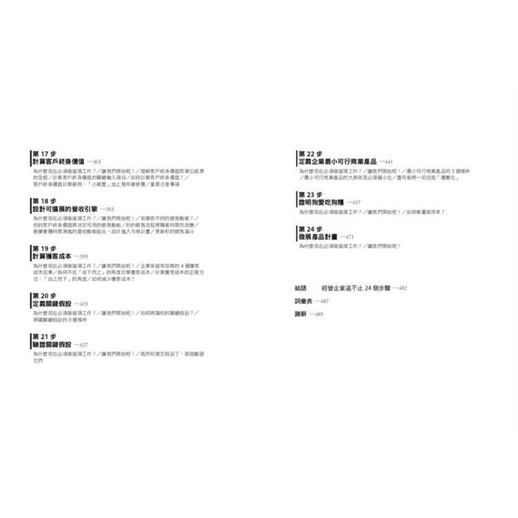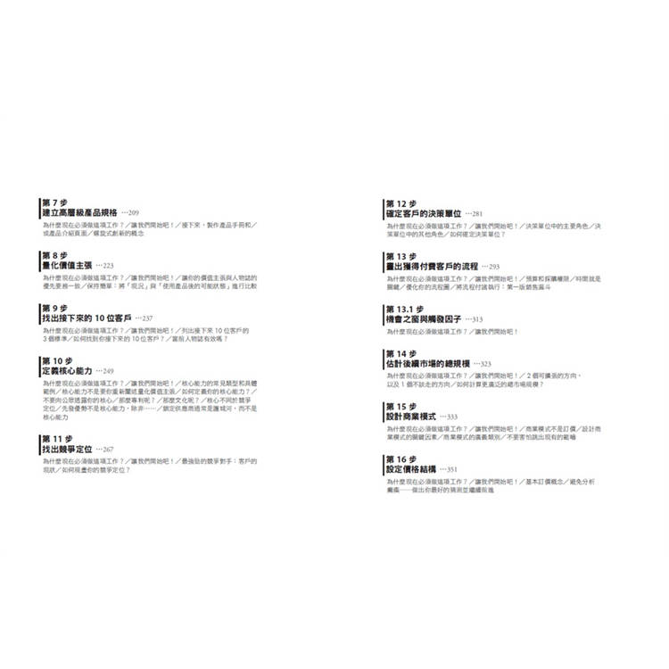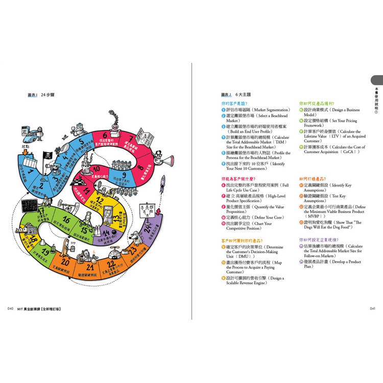 本書以二十四個步驟為架構來說明商業化的過程,從市場區隔開始,逐步推進到目標客戶、價值主張、決策單位、獲客方式、商業模式與關鍵指標,再到產品設計與規模化的思考。這些步驟看似有順序,實際運作時卻需要不斷回頭檢查與修正。讀者在過程中會反覆調整原先的假設,重新理解市場,再修正原本的設計。