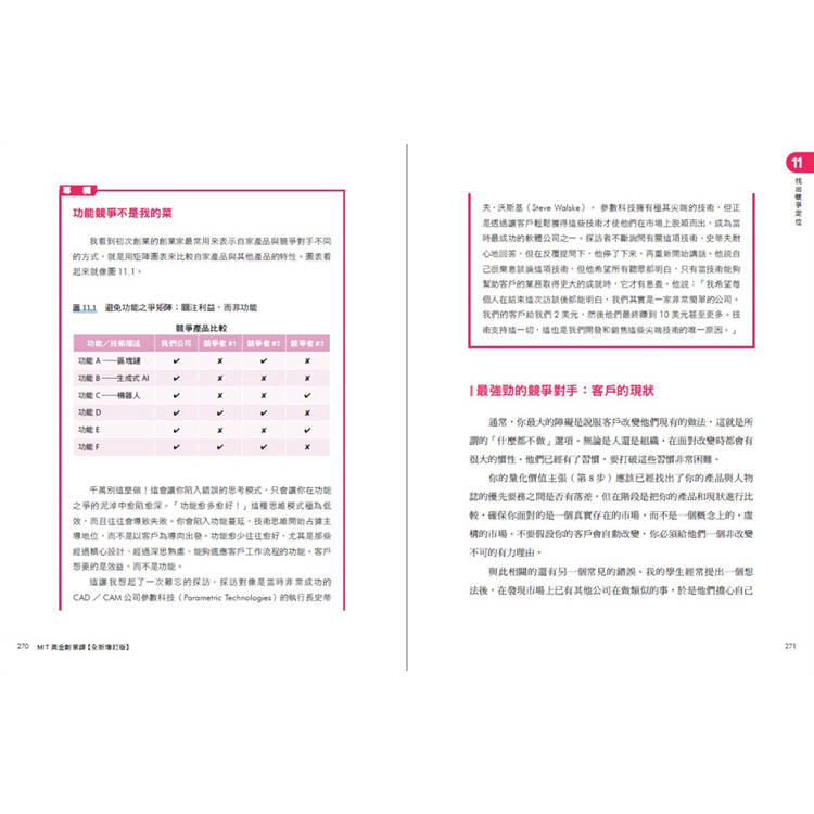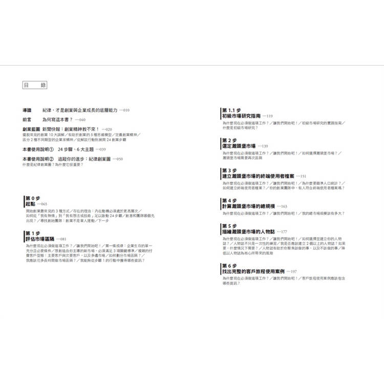 1|完整24步驟是全球最有系統的創業方法:多數創業書談論觀念、談理論、談個人經歷,本書卻把創業拆解為 24個具體步驟,從市場區隔、灘頭堡市場、人物誌……到產品計畫,形成一套完整的創業流程。讀者不只理解創業,更知道下一步該做什麼。