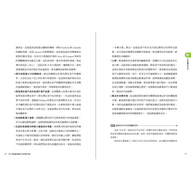 6.在設計商業模式時納入獲客成本考量:商業模式的設計會對你的獲客成本產生重大影響,正如吉姆.道提在內連結公司的經驗所顯示的。內連結公司提供投資銀行家與律師一個安全的線上空間,讓他們能與客戶分享文件。最初,他的商業模式是以使用量計費,但這對客戶來說難以購買,因為他們無法預先規畫使用成本。當他改採類似「手機方案」模式,也就是客戶每月支付固定費用以取得特定服務,並可依使用量彈性加購額外服務後,產品變得更容易銷售, 銷售週期也大幅縮短。