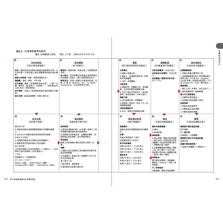 也正因為如此,這本書與多數強調靈感或速度的創業書籍,有著明顯差異。它不鼓勵在不確定中快速擴張,而是要求在投入資源之前,先完成必要的驗證。書中所提供的操作表單與分析工具,讓這些驗證可以具體執行,而不是停留在概念層次。例如在市場區隔與目標客戶的選擇上,書中提供清楚的分類與篩選方式;在價值主張的描述上,有結構化的整理框架;在商業模式與財務邏輯上,則透過具體指標與計算方式,讓原本模糊的判斷變得可以檢驗。