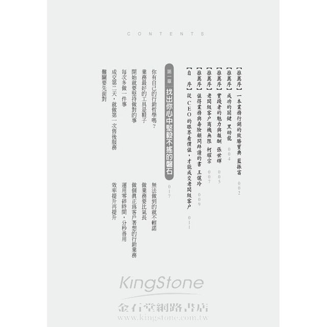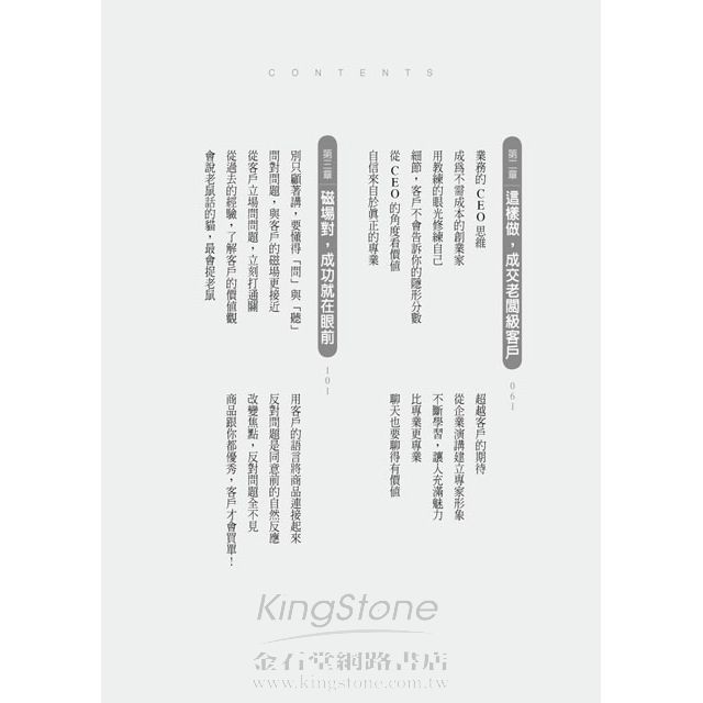 業務的CEO思維/成為不需成本的創業家/用教練的眼光修練自己/細節,客戶不會告訴你的隱形分數/從CEO的角度看價值/自信來自於真正的專業/超越客戶的期待/從企業演講建立專家形象/不斷學習,讓人充滿魅力/比專業更專業/聊天也要聊得有價值