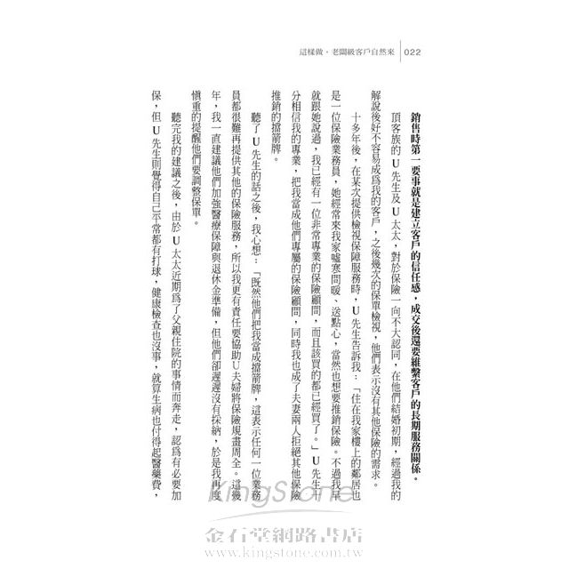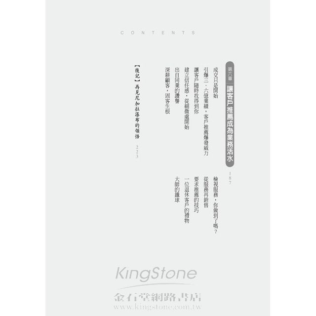 成交只是開始/引爆三.六億業績,客戶推薦爆發威力/讓客戶隨時找得到你/建立信任感,從細微處開始/出自同業的讚譽/深耕顧客,固客生根/檢視服務,你做到了嗎?/從服務中再銷售/要求推薦的技巧/一位退休客戶的禮物/大師的鐵球