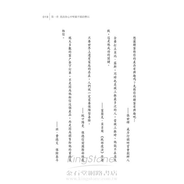 ◇政大風險管理與保險系住任 王儷玲、博客來數位科技公司董事長 林丕容、朝代企管顧問公司總裁 柯耀宗、紐約國際管理顧問公司總經理 陳文敏、威力行銷研習營創辦人 張世輝、台灣科學工業園區科學同業公會祕書長 張致遠、博達汽車董事長 張麗玉、大學光學醫療集團董事長 歐淑芳、台灣卡內基負則人黑幼龍、保德信國際人壽總經理 藍振富◎誠摯推薦(依姓名筆畫排序)