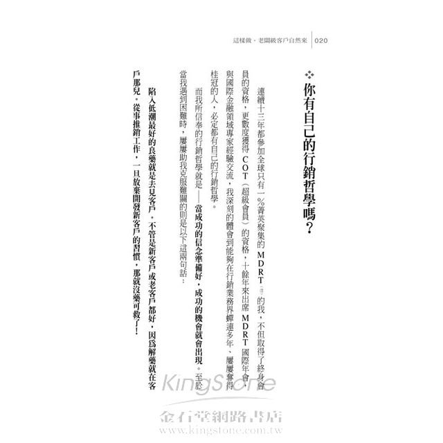 你有自己的行銷哲學嗎?/業務最好的工具是鞋子/開始就要堅持做對的事/每次多做一件事/成交第二天,就做第一次售後服務/難關要先面對/無法做到的就不輕諾/做業務要比氣長/做個真正為客戶著想的行銷業務/運用零碎時間,分秒善用/效率提升再提升