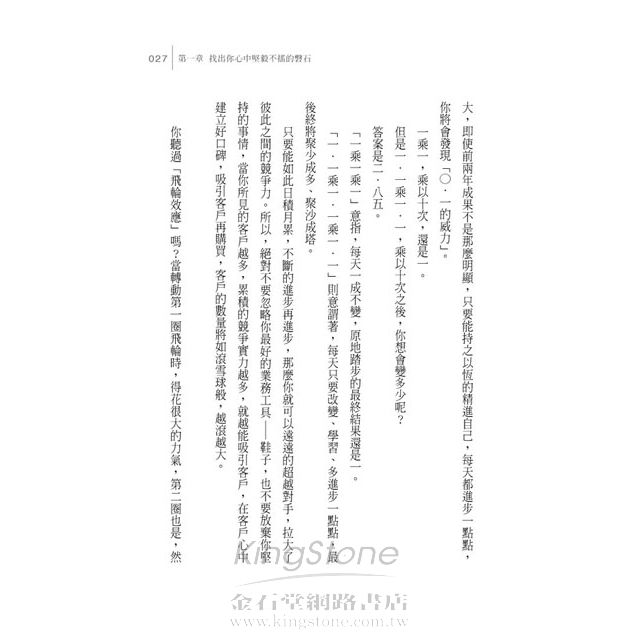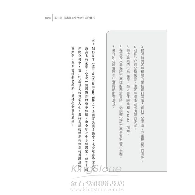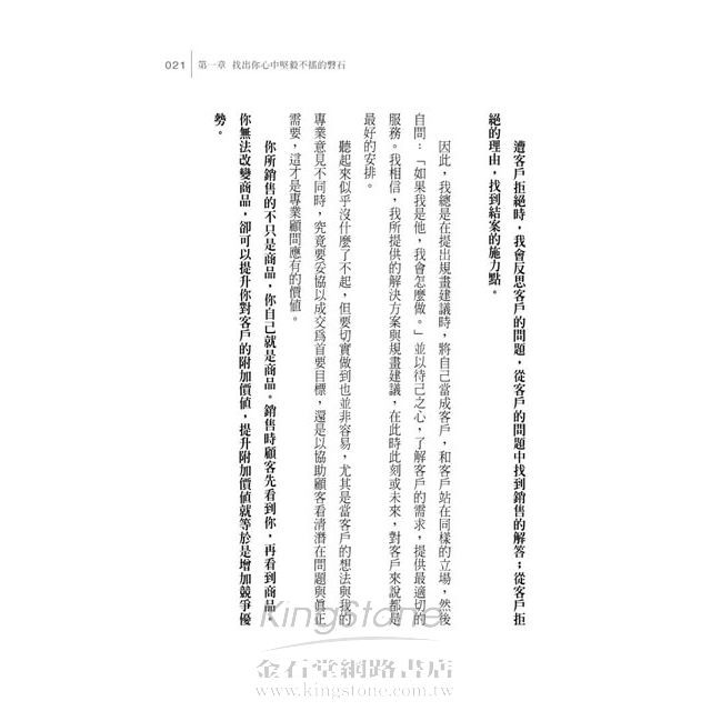 關鍵一:從跌倒的地方再出發/關鍵二:照顧客戶的奇檬子/關鍵三:將反對問題轉為結案施力點/關鍵四:從反對理由說故事/關鍵五:就是要和別人不一樣/關鍵六:不怕峰迴路轉,就要使命必達/關鍵七:提供解決方案,協助客戶做決定