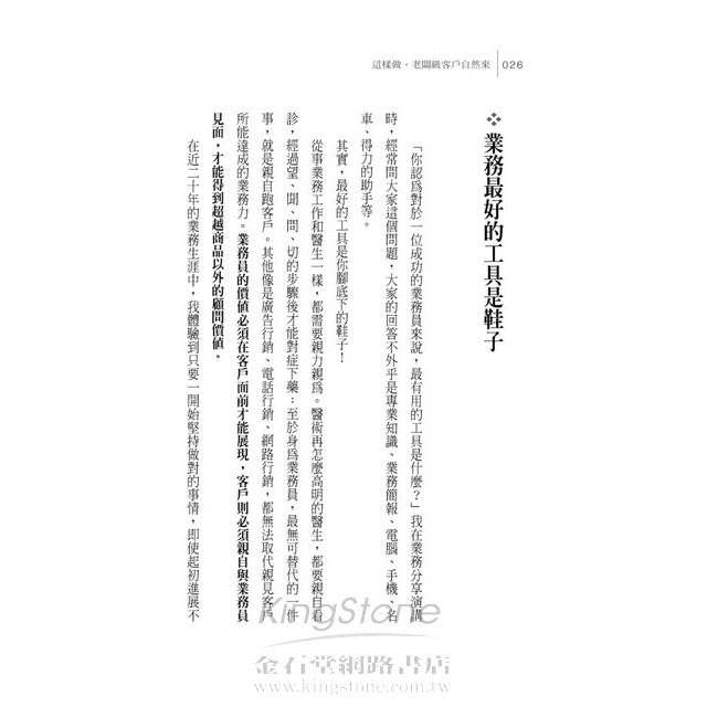 本書要談的不僅是如何切入客戶內心想要的。成交,只是業務關係的開始,要提供超出客戶期待的服務,讓客戶推薦成為業務活水,以及如何提升客戶層次使績效倍增,做一個能夠與老闆級客戶平起平坐的業務員。