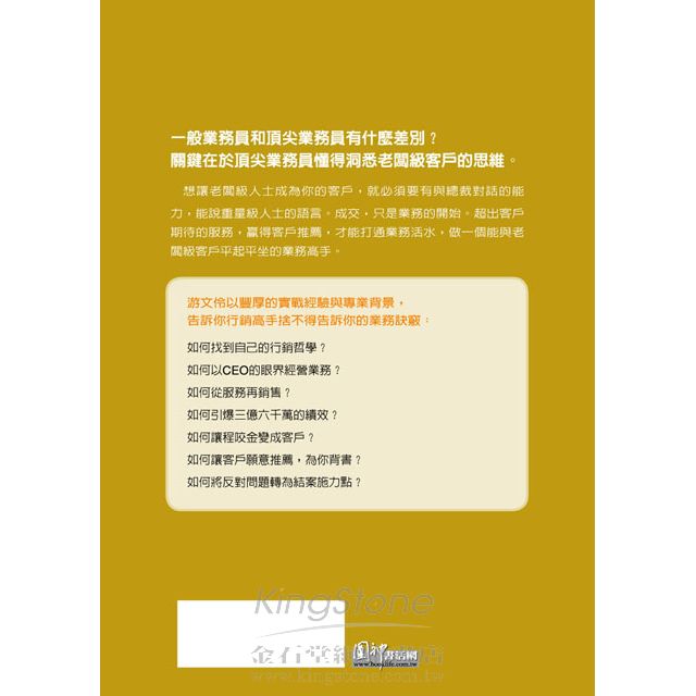 所謂「老闆級客戶」,指的是企業總裁、董事長、總經理、部門主管、店家老闆,以及家庭中的決策者。想要成交老闆級客戶,首先要有CEO的思維,用教練的眼光修練自己,從CEO的角度看價值。唯有透過不斷學習,使人充滿魅力,才能讓老闆級客戶更欣賞你。