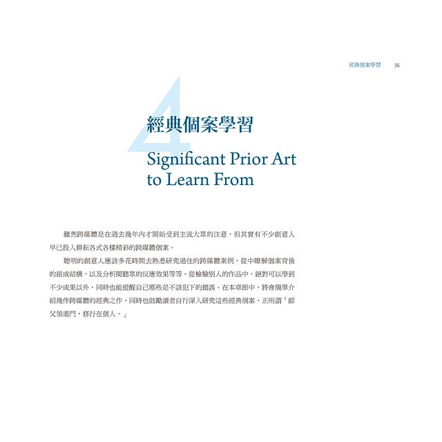 本書將協助讀者自我定位,以朝向成為一名跨媒體創意人做準備;假如你已踏進跨媒體領域的話,也可藉此提升其它技能。首先我將會從一些「跨媒體」的歷史做為切入觀點,內容會涵蓋一些基本敘事的技巧。再來談及跨媒體技能及製作元素;換句話說,便是如何讓故事,分段散佈在不同媒體平台之中、如何建構單一綜合體(或不是)的跨平台故事、如何找經費、如何建立團隊、如何整合新媒體。