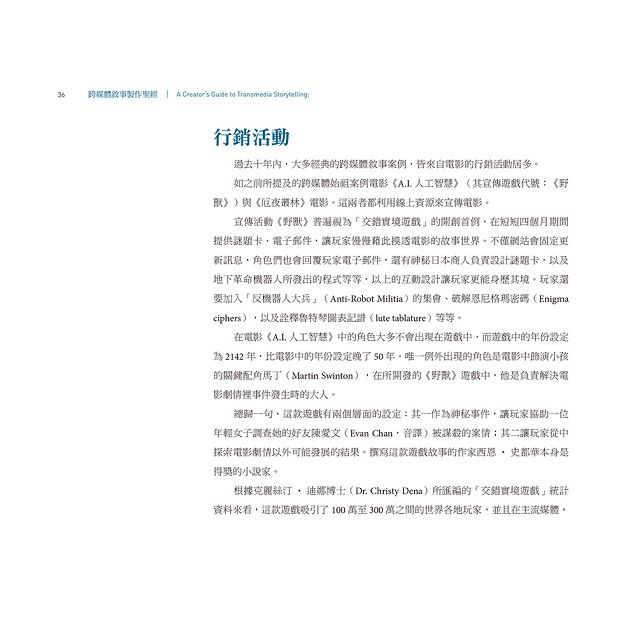 《跨媒體敘事製作聖經:一網打盡虛擬和實境的多平台行銷創意學》一書,正是我想用自己的方式,來啟動公開對話的一步。我希望透過本書來分享過去幾年所累積的跨媒體製作經驗,且順道分享相關得獎作品:為宣傳HBO知名影集《冰與火之歌:權力遊戲》(Game of Thrones)設計的遊戲《君主之道》(The Master’s Path)、與索尼影業合作的商業互動網路遊戲《尋謎之城》(Perplex City)以及非營利的人權遊戲《美國2049》(America 2049)⋯⋯等等。