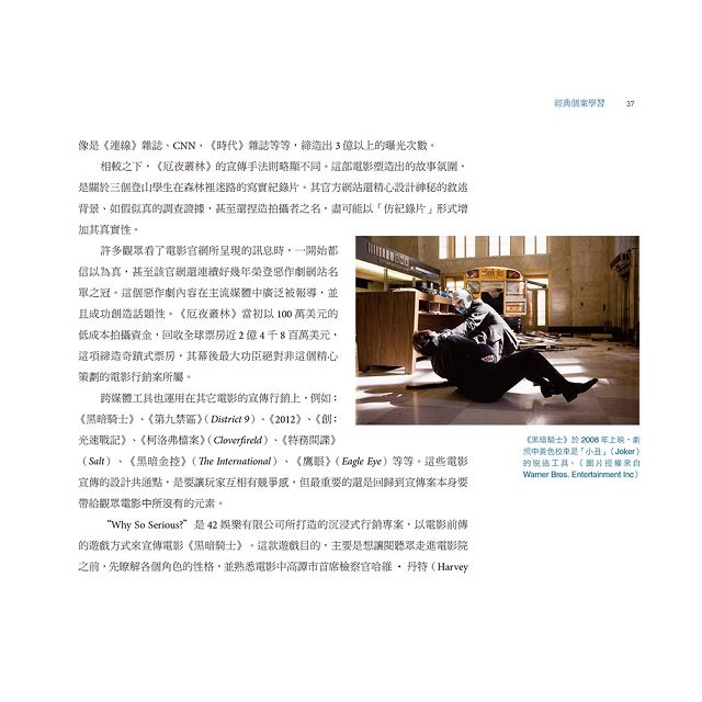然而,從本書裡的訪談段落裡,也可一窺知名創意人的製作心得,有的作品來自紅極一時的獨立電影《厄夜叢林》(The Blair Witch Project)、MTV電視台的沉浸式影集《維蒙小鎮》(Valemont),還有電影《黑暗騎士》(The Dark Knight)的得獎行銷作品“Why So Serious?”。這些創作人帶給我非常豐富的創作啟發,而我也希望他們也能啟發你一些創作靈感。