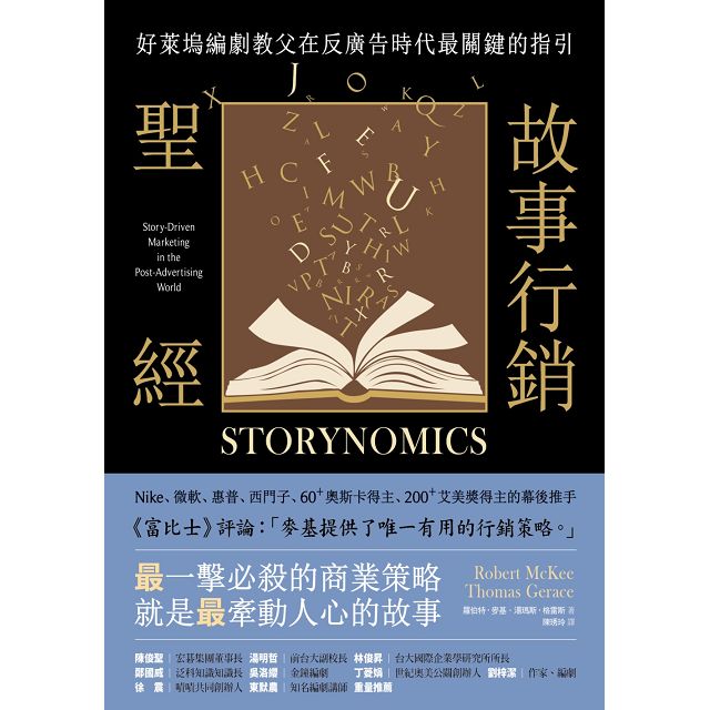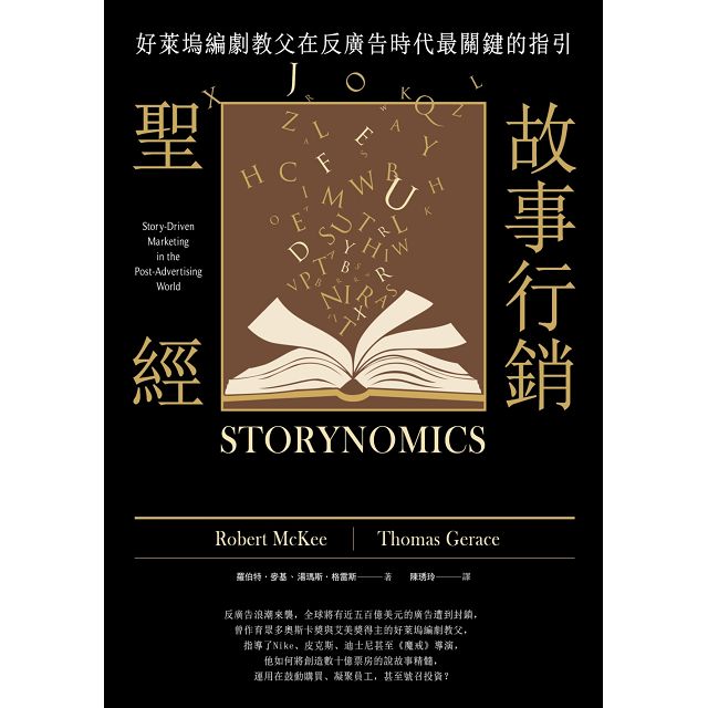曾作育眾多奧斯卡獎與艾美獎得主的好萊塢編劇教父──羅伯特‧麥基(Robert McKee),指導了Nike、皮克斯、迪士尼甚至《魔戒》導演,更是六十多位奧斯卡得主與兩百多位艾美獎得主的幕後推手,他與哈佛出身的數位行銷先驅湯瑪斯‧格雷斯(Thomas Gerace)聯手,在《故事行銷聖經》中合作探討:一個誘人的故事包括哪八個階段,每個階段要如何設計主角行動與劇情轉折?怎樣的故事不算是故事(別以為有人物出來講幾句對白就算是故事囉)?如何運用故事進行「行動呼籲」,讓消費者願意按下購買?一個普通中性的品牌,品質再堅不可摧,在消費者心中依然船過水無痕;但融合了故事與情感的品牌,即使無法站上業界之巔,大眾也願意為你駐足聆聽!
