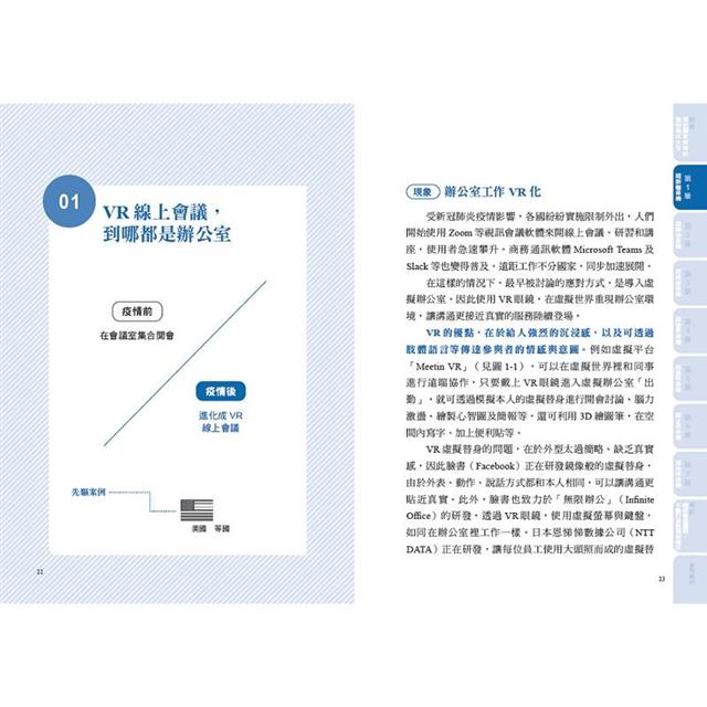 書中包含「超距離」、「超購物」、「超娛樂」、「超奢華」、「超資訊」、「超企業」、「超地域」七大領域,共69個成功案例,讓讀者可以看到世界各國,在面對新冠疫情肆虐,採取的措施與新商業模式。例如,在跨越距離限制的「超距離」商機中,因疫情限制外出,英國和泰國實施VR旅遊,將知名景點搬上線,民眾透過螢幕就能虛擬旅遊,彷彿身歷其境。