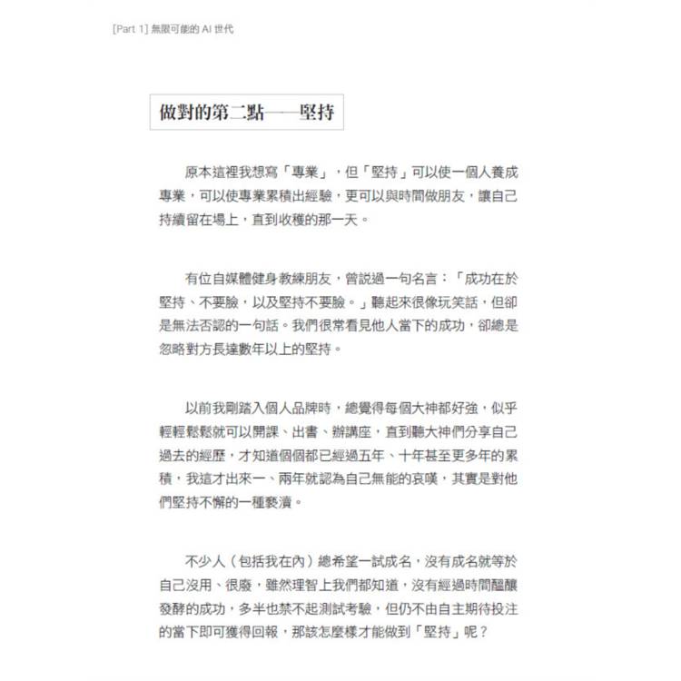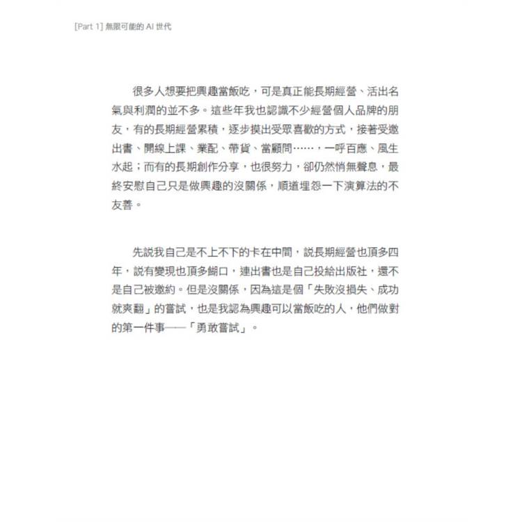 「以前沒有AI,光要『想』一篇文章就想破頭;現在有了AI,不管你是要用AI產生整篇文章再去修改,還是用AI產生大綱再去寫,都可以秒速做到。這不是一本教你如何賺快錢的AI工具書,而是一本寫給素人創作者的『個人品牌AI使用說明書』。Penny用誠實而溫柔的筆觸,把看似冷冰冰的AI,轉化為你找到定位、打造影響力、穩穩變現的起點。」