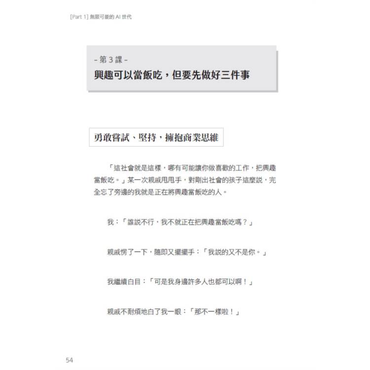「興趣可以當飯吃,但要先做好三件事。」這是Penny這幾年來的真實實踐,她沒有急著告訴你怎麼成功,她先教你怎麼不跌倒。從勇敢嘗試、堅持下去,到理解商業本質與使用AI優化工作流程,這本書是一份寫給想活出自己版本人生的行動地圖。