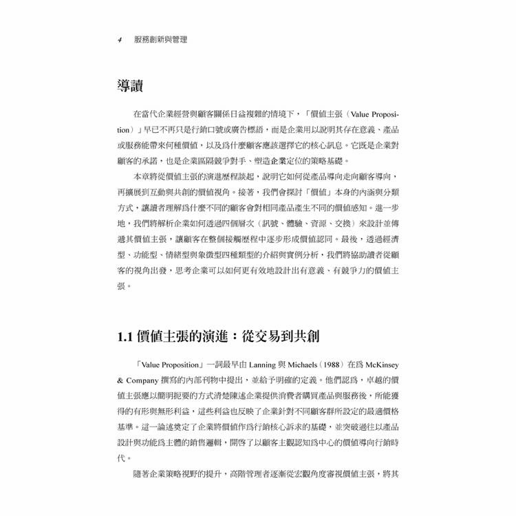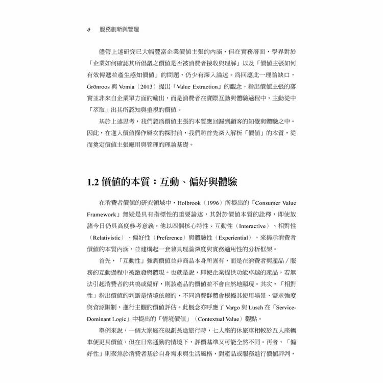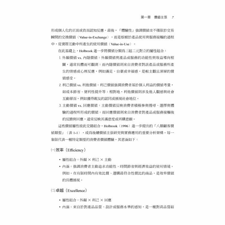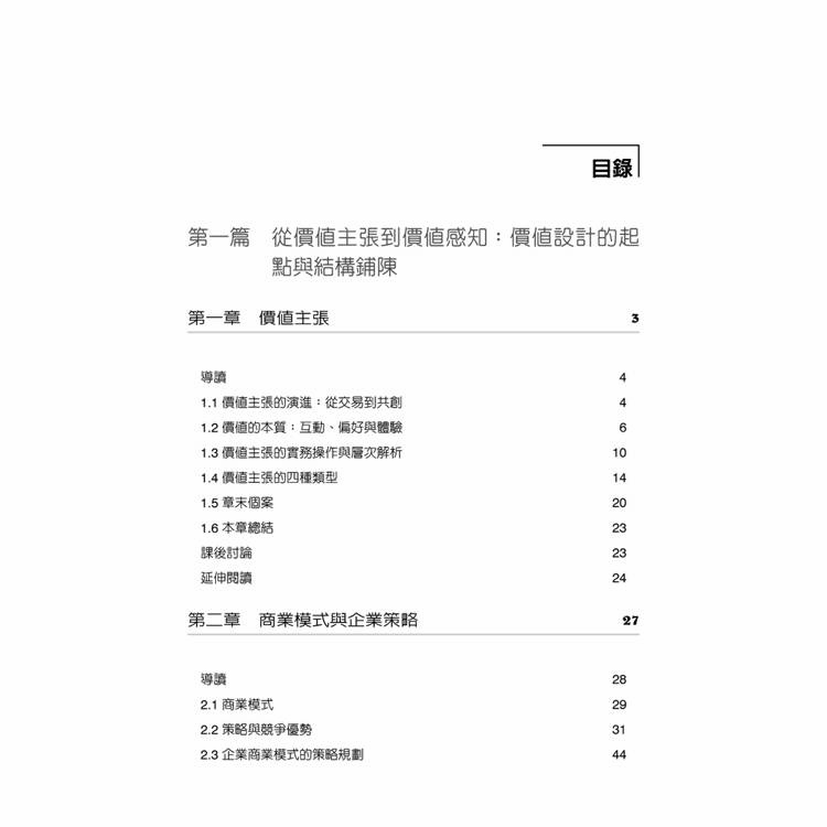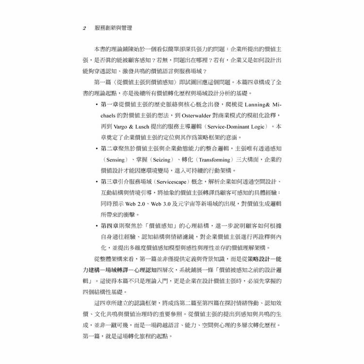 . 第一篇〈從價值主張到價值感知〉(第一∼四章)為理論奠基,系統建構價值主張的定義、能力結構、場域配置與心理感知的基本架構,是理解全書的核心起點。