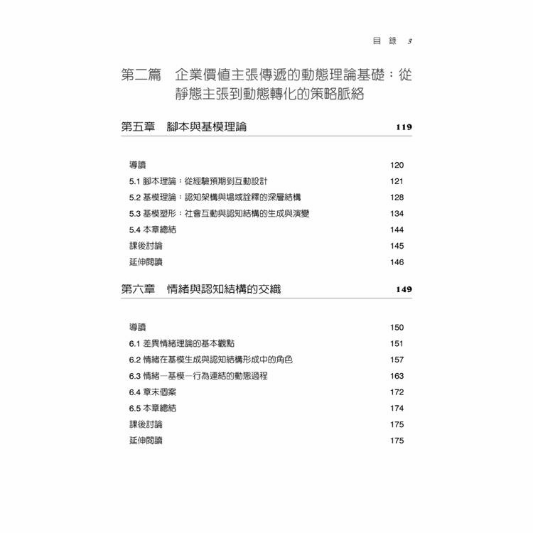 . 第二篇〈企業價值主張傳遞的動態理論基礎〉(第五∼八章)則從情緒啟動、認知結構、情緒動力與價值效價等心理層面出發,深入刻畫顧客如何在場域中感知、詮釋與記憶企業的價值主張,為第九章「動態價值轉化模型」提供心理與行為的完整理論根基。