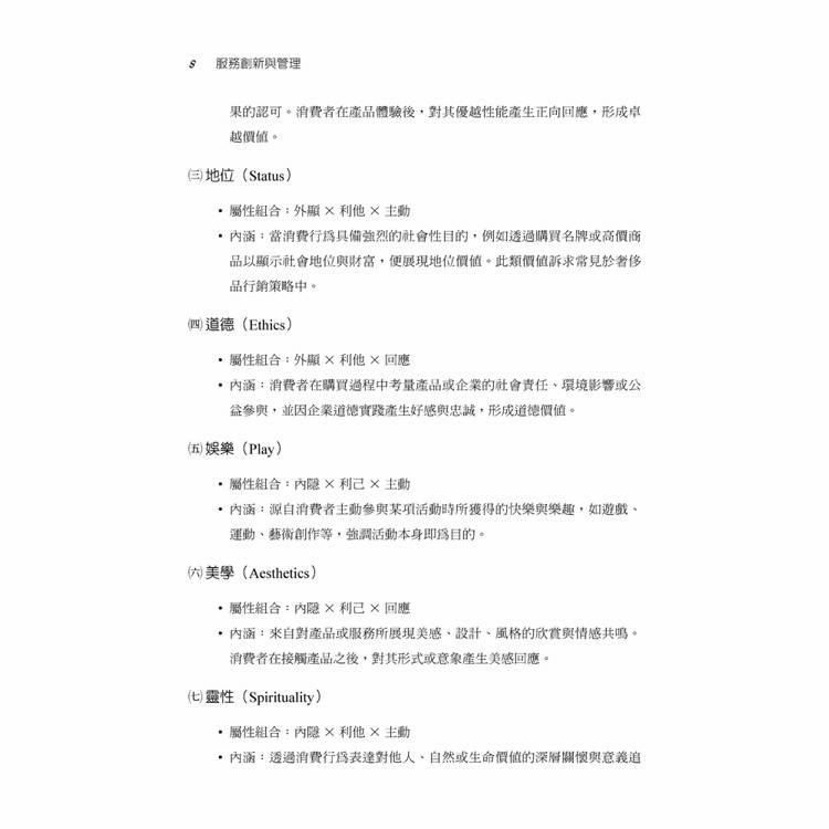 . 第三篇〈轉化企業價值主張到消費者價值感知〉(第九∼十五章)是本書的核心篇幅,提出一套從企業價值主張出發,經過微觀情緒引導、中觀體驗節奏,到宏觀價值共鳴與文化再生的完整模型,並輔以多個企業個案深入分析其價值實作策略。