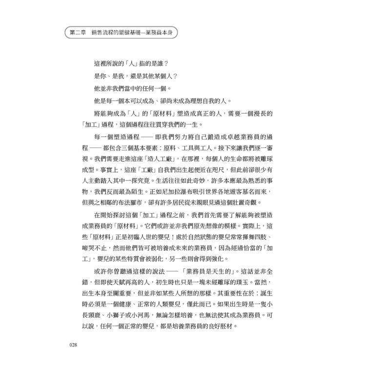 銷售是銷售流程的首要環節,也是本書第一章的主題。在此,我們暫且不談任何成功銷售所離不開的「人」的因素與「術」的運用──這些將是後續章節的重點。在第一章裡,我們聚焦於「銷售」這個核心要素。