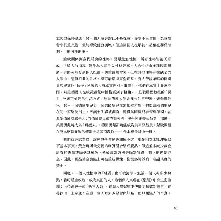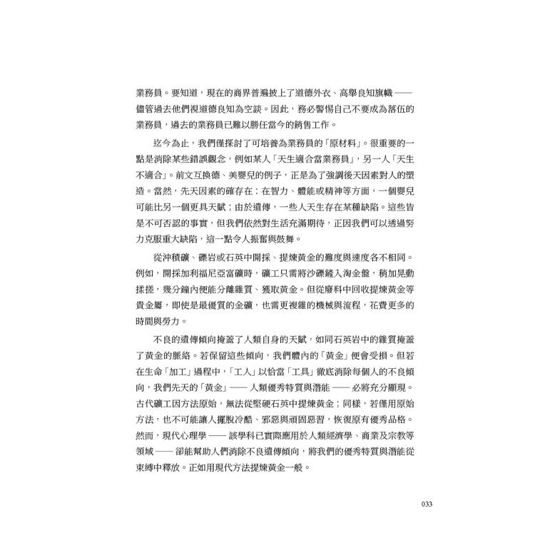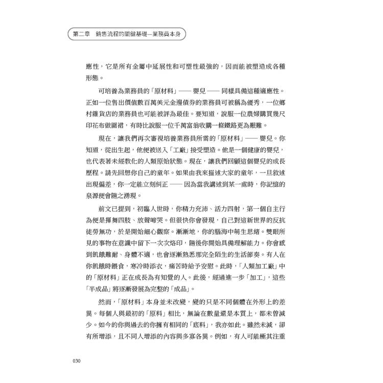 作者進一步將業務員的養成比喻為工廠加工過程:嬰兒是「原材料」,透過正確工具與方法,方能成為成熟的銷售人員。他反駁「天生業務員」的迷思,指出人與人之間的差異多來自後天塑造,而非先天決定。如同礦石中皆蘊含黃金,只需提煉雜質,即可顯現純金本質;人亦可透過自我修養與訓練,去除性格缺陷,發揮潛能。健全的業務員必須具備三位一體的完整人格:健康體魄、聰慧頭腦與高尚精神。三者相互影響、彼此支撐,缺一不可。作者強調,體能訓練能強化意志與勇氣,心理狀態亦會反向影響身體表現;智力則需透過多感官刺激與反覆練習來培養;至於精神層面,更須在誠信與道德標準上自我要求。現代銷售已不容投機取巧,唯有品格端正者,方能長遠發展。