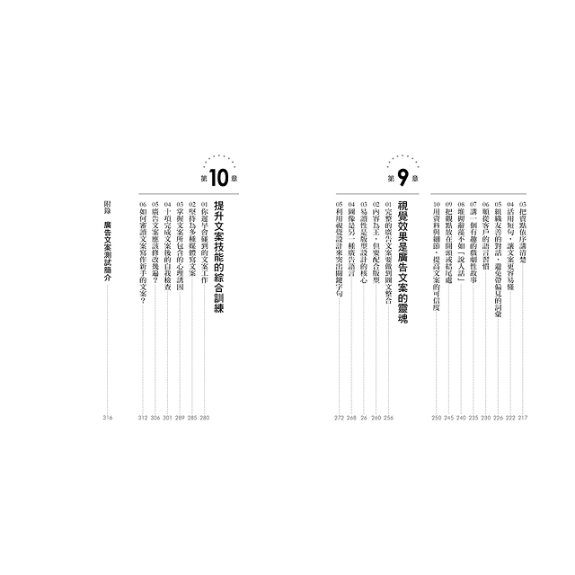 本書包含了大量改編自真實案例的練習。有心從事廣告文案工作的朋友可以按照練習要求自行訓練,把每個章節的具體知識融會貫通,並與真實案例中的作品進行對比。相對於那些專家大師的手筆,作為初學者的你當然有很多青澀和不成熟的地方。不過,所有的專家大師都經歷過與你相同的菜鳥階段。通過對比來強化學習,相信大家能很快提高自己的文案寫作水準。