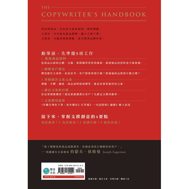 千里之行始於足下,各位的步子先別跨太大,還是先從寫出第一個讓客戶感興趣的廣告文案學起吧!當然,這一步一定很漫長,不經歷足夠多的失敗,不吃足夠多的教訓,根本無法完成。為此,本書從零基礎開始講起,領初學者入門,助新老手提升。