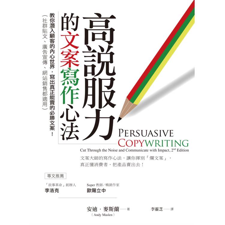 《高說服力的文案寫作心法》展現寫作的魅力,內容從古希臘的寫作理論一直談到fMRI技術,進一步精煉你的文字,好讓你抓住讀者的目光。本書不單探討文案的說服力和銷售力,更能啟發、迷惑和撫慰讀者的心靈。