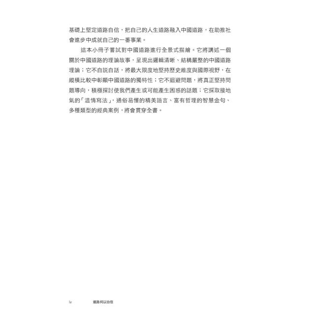 本書嘗試對中國道路進行全景圖繪,講述一個關於中國道路的理論故事,呈現一套邏輯清晰、結構嚴整的中國道路理論;本書堅持歷史維度與國際視野,在縱橫比較中彰顯中國道路的獨特性;將真正堅持問題導向,積極探討使我們產生或可能產生困惑的話題。全書通俗易懂,並貫穿了富有哲理的金句和經典案例。