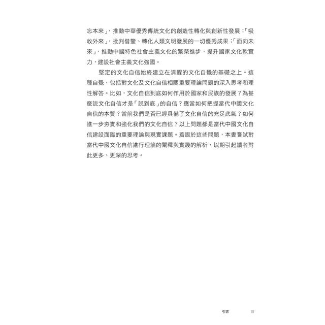 在當今世界不同思想文化相互激蕩、文化軟實力競爭日趨激烈的背景下,增進文化自信已成為各國普遍關注的時代性課題。本書闡釋和說明了文化自信到底如何作用於國家和民族的發展?為甚麼說文化自信才是「說到底」的自信?應當如何把握當代文化自信的本質?當前我們是否已經具備了文化自信的充足底氣?又如何才能進一步提升和堅定我們的文化自信?透過對當代中國文化自信進行理論闡釋與實踐解析,以期引起讀者更多更深的思考。