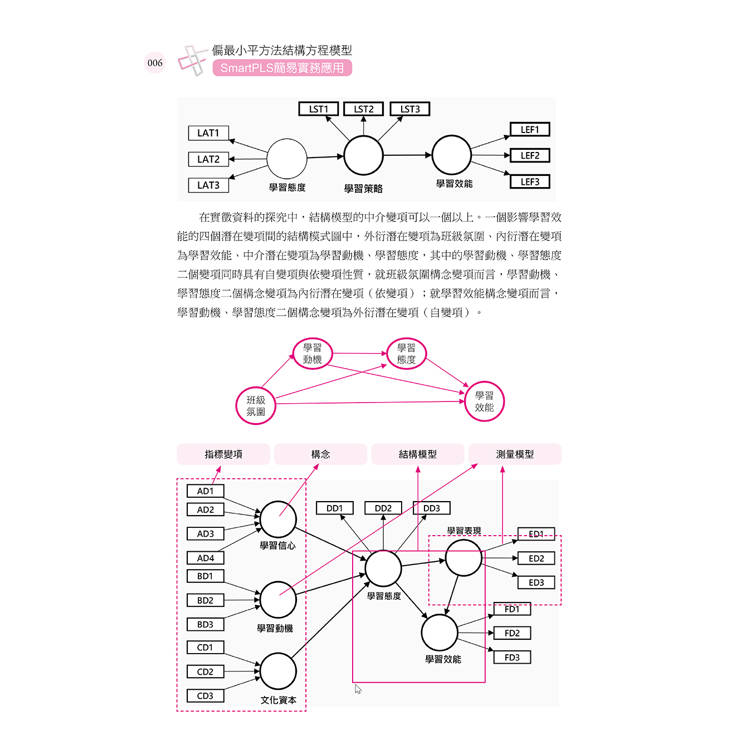 本書撰寫的出發點,主要是協助眾多結構方程模式的初學者,使用PLSSEM方法進行學術研究資料分析的應用能力,讓SEM的初學者能有效突破進行模型分析的困境,使其能快速應用PLS-SEM分析方法於學術研究或論文投稿。有鑑於此,本書將採用目前廣受歡迎且操作界面友善的SmartPLS軟體為實作工具,並以實例分析的具體操作,逐步帶領讀者理解PLS-SEM的理論架構與應用方式。